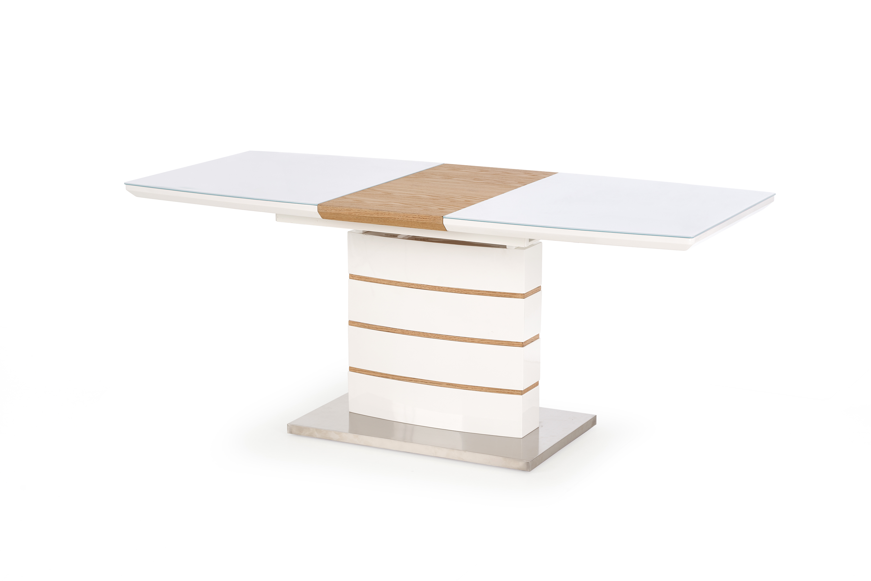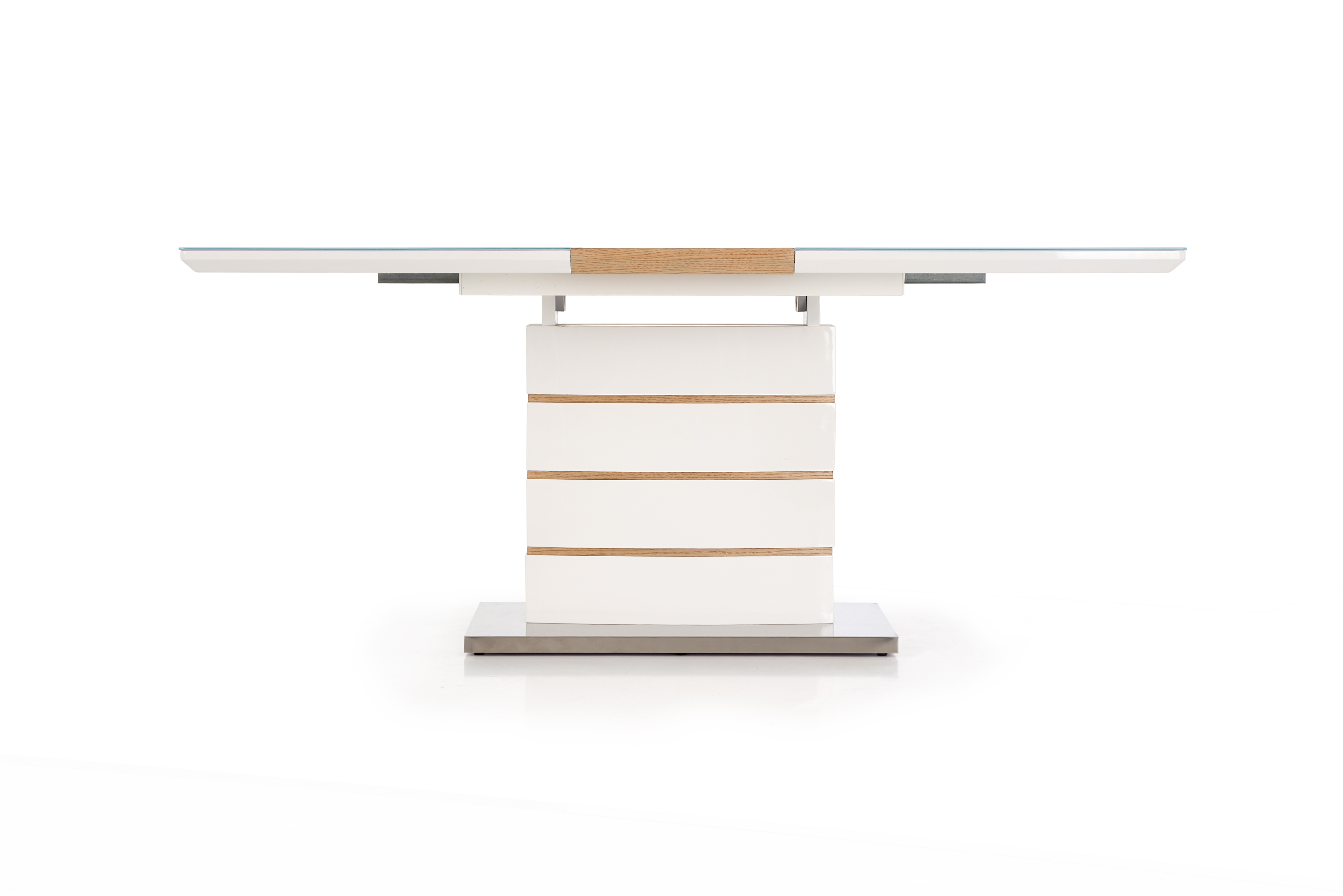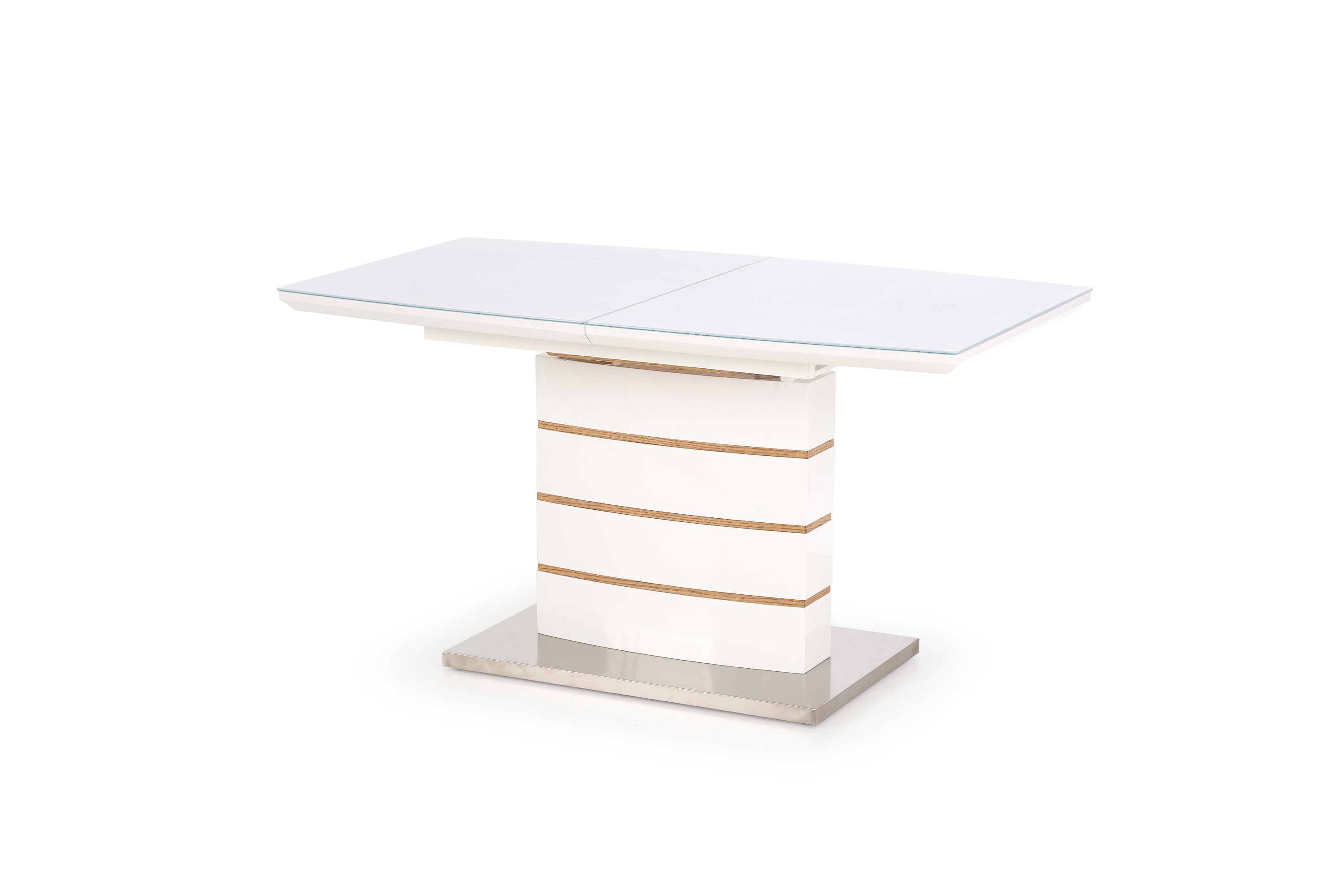 pikenduslaud, mõõdud: 140-180/80/76 cm, materjal: lakitud MDF + naturaalne spoon / klaas / roostevaba teras, värvus: valge / kuldne tamm