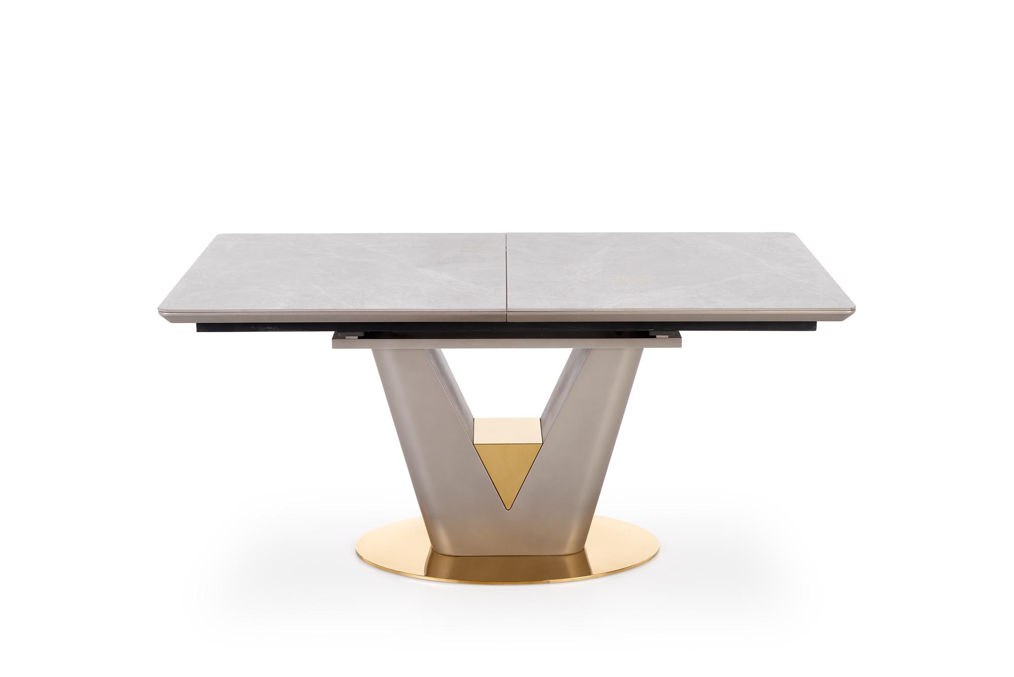 mõõdud: 160-220/90/76 cm, pikenduslaud, materjal: keraamika / lakitud MDF / kroomteras, värvus: pealispind – hall marmor, jalad – helehall / kuld