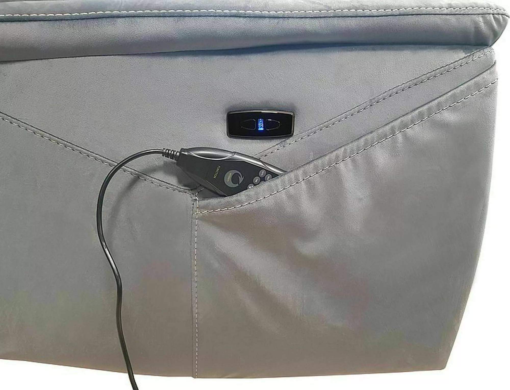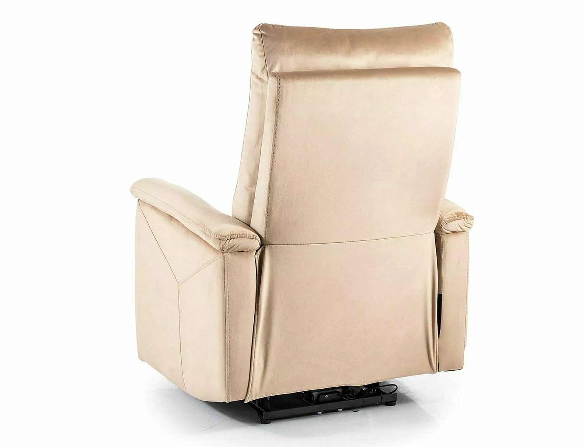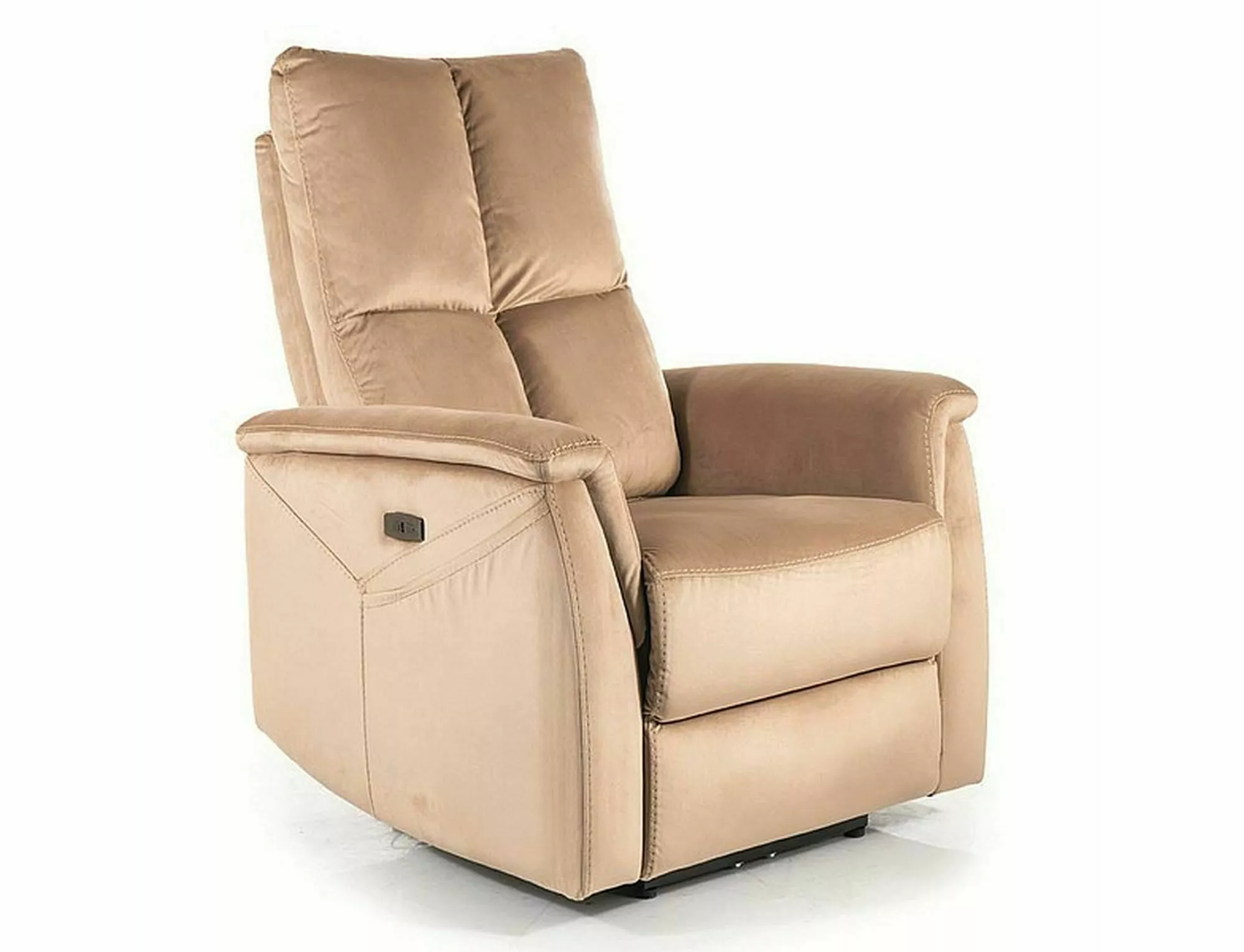 Massaažfunktsiooniga elektriliselt lamav tugitool, sametkangas: sinine, värvid: beež 28. Lamamist saab juhtida tugitooli paremal küljel asuva paneeli abil. Paneel on lisaks varustatud valgustatud USB-pordiga. Juhtmega kaugjuhtimispuldiga reguleeritavad massaažifunktsioonid, valikus: tööaeg, massaaži tsooni ja intensiivsuse valik, nimmepiirkonna soojendus. Tooli küljel on praktiline tasku.