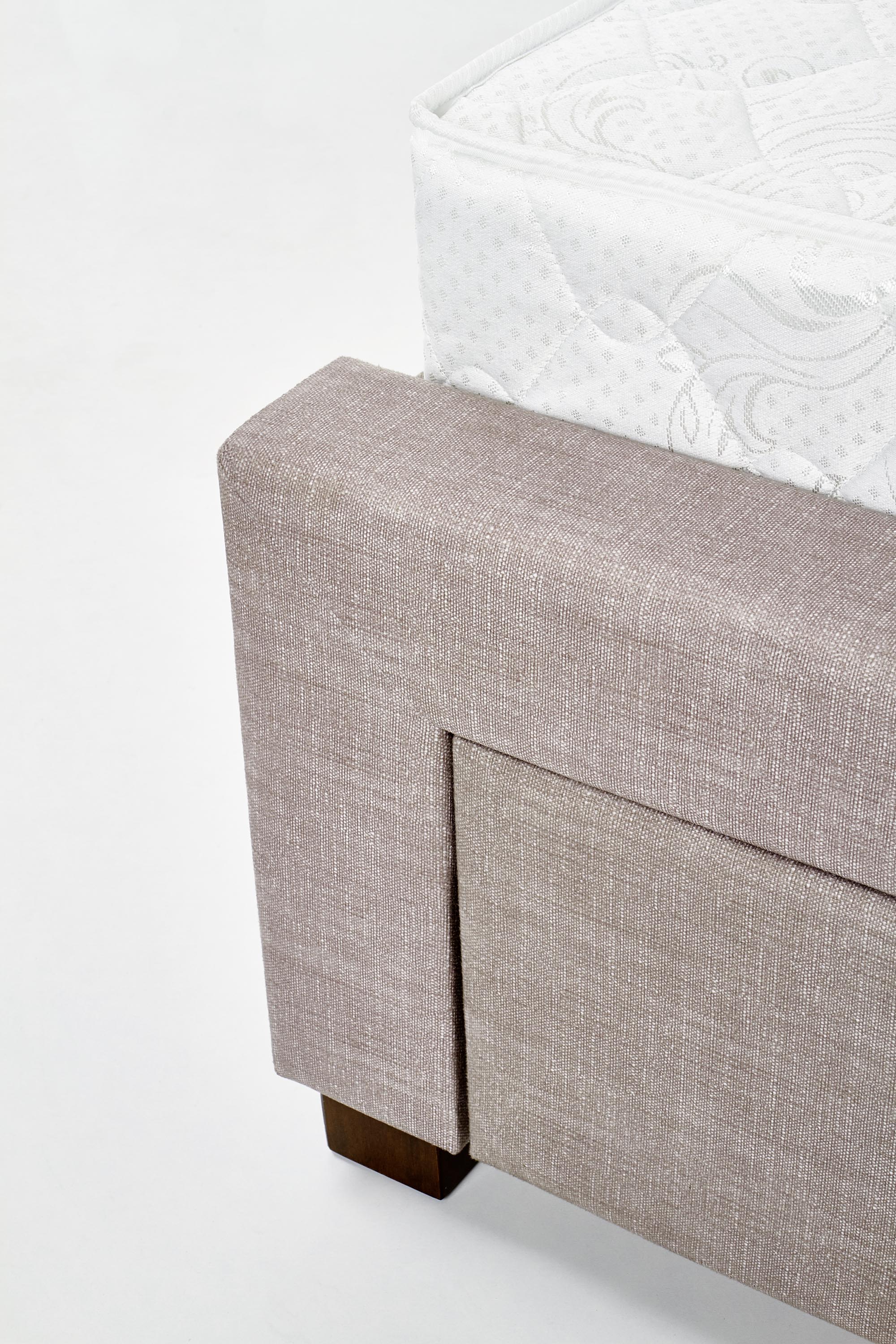 mõõdud: 164/215/111 cm, sahtlitega voodi, materjal: riie / täispuit, värvus: riie – beež, puit – pähkel