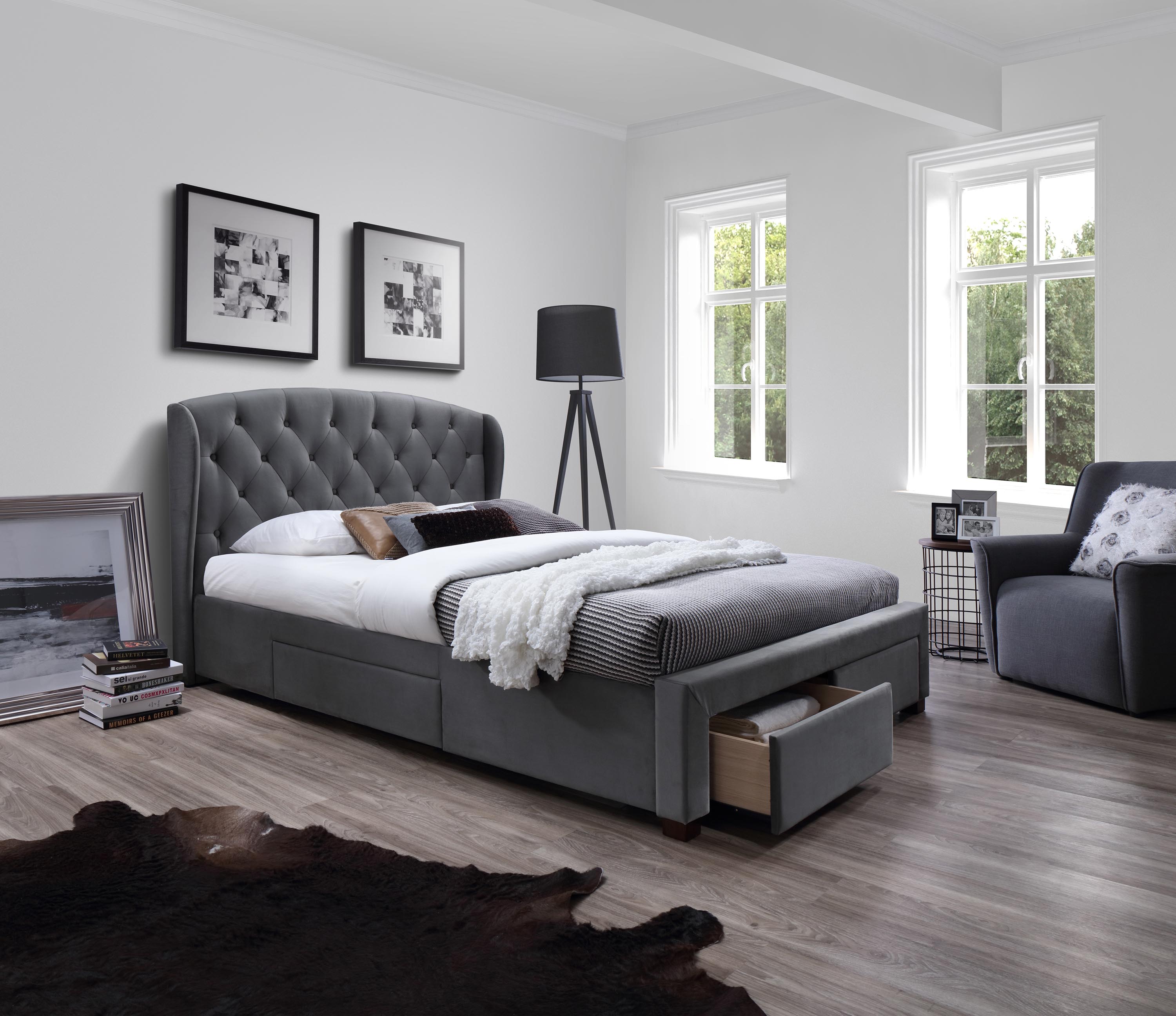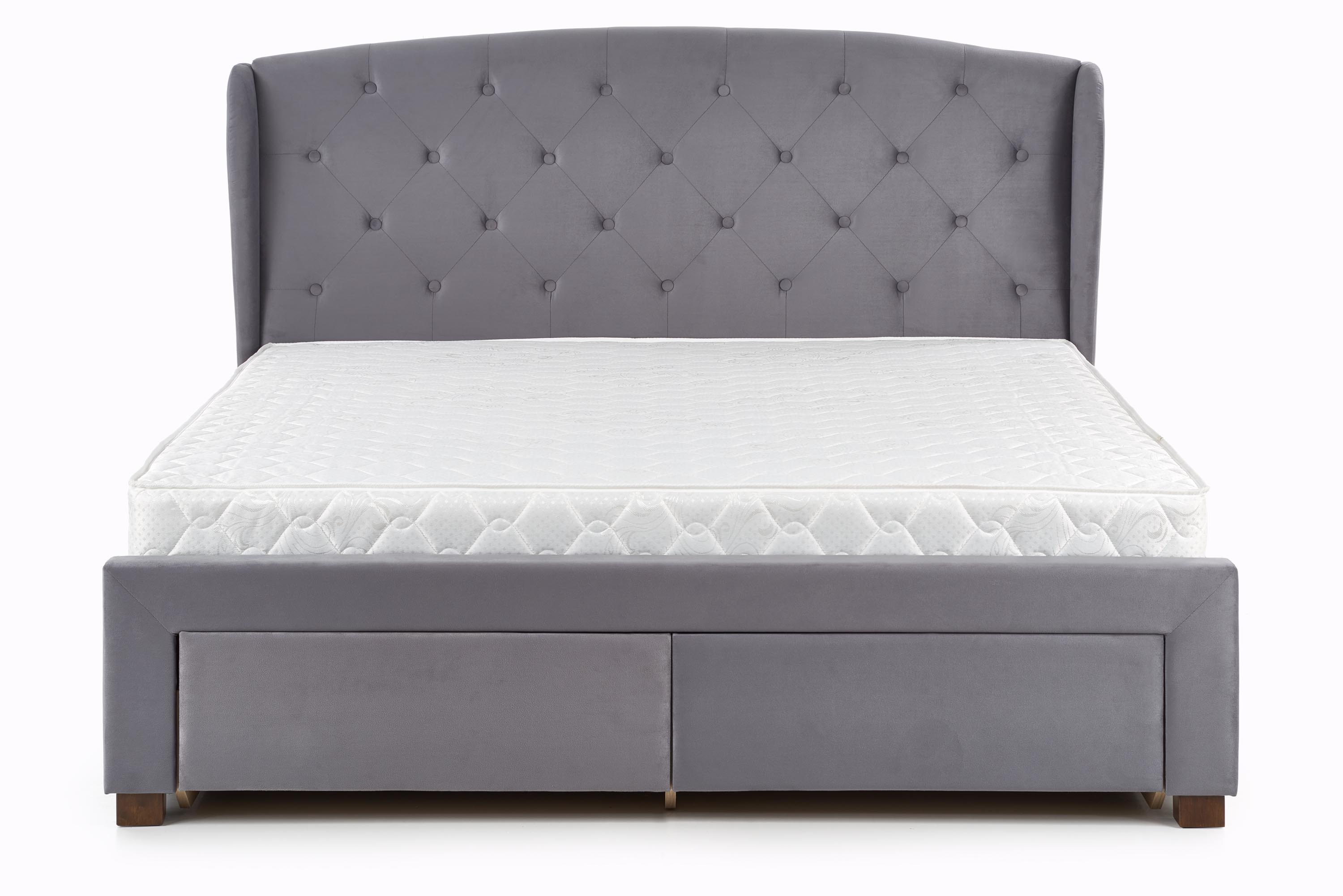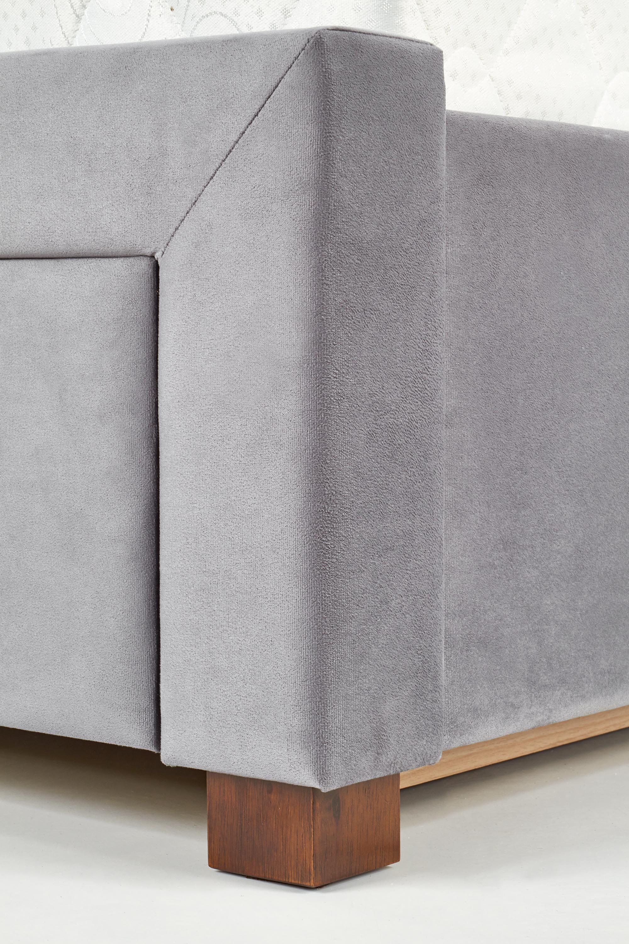 mõõdud: 171/218/111 cm, sahtlitega voodi, materjal: riie / täispuit, värvus: riie – hall, puit – pähkel